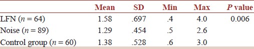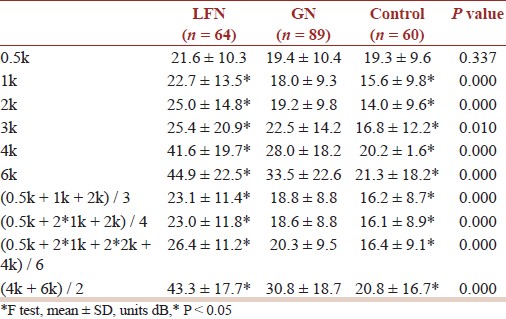 Based on the regulations regarding labor health examinations, a hearing test is a mandatory item to be performed during health checks. The result can be used to calculate the hearing loss index. It was found that, except for 0.5k, the hearing loss of all the personnel in the three groups (measured at 1k, 2k, 3k, 4k, and 6k) exhibited statistical differences (scheffe test P < 0.05). As far as (0.5k + 1k + 2k)/3 methods (3-divided) was concerned, the hearing loss of LFN group and GN group did not disclose significant differences. However, it was close to a statistically significant difference when the (0.5k + 2*1k + 2k)/4 method (4-divided) was used (P = 0.059). In general, hearing loss for the LFN and GN groups became serious at higher frequencies, especially at 4k and 6k where the hearing loss of the LFN group reached 40 dB, and was 10 dB higher than that of GN group [Table 4].