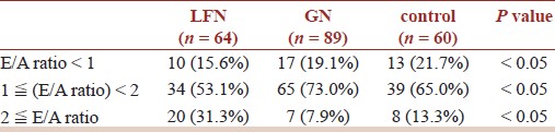- The abnormality rate of the E/A ratio between the GN group and the control group did not show a significant difference.